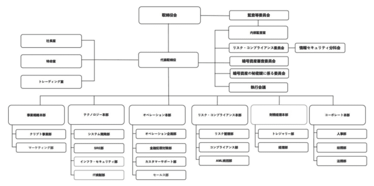 ここでは、国内の暗号資産取引所が公開している実際の組織図をもとに、取引所運営に必要な中核機能を確認します。